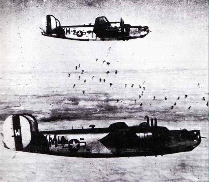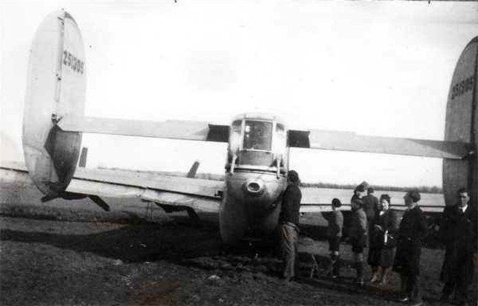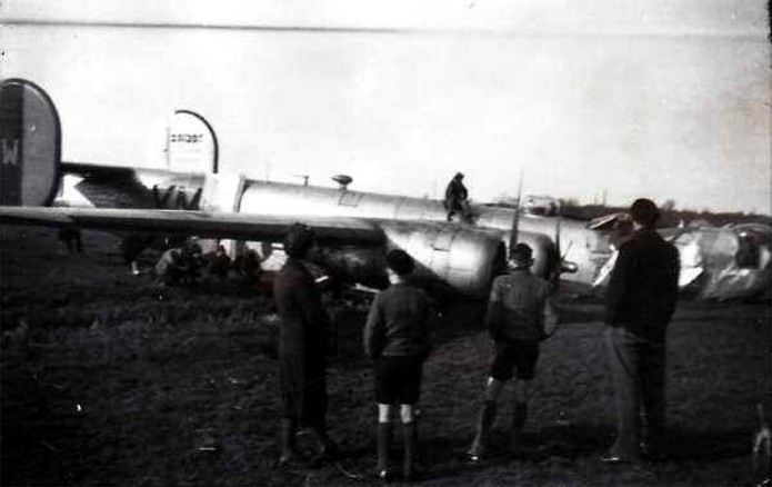 Ce bombardier quadrimoteur est un B-24 Mle J reconnaissable à la forme particulière de sa tourelle avant. Il s’agit d’une des dernières versions de cet appareil. L’étude de son marquage lui donne le N° de serial 42-51305. Le W est le code de l’appareil. YM nous apprend que ce bombardier appartient au 409e escadron de bombardement du 93e* groupe de bombardement de la 8e US AIR FORCE. Il est stationné à Hardwick en Grande-Bretagne. Son pilote était le Lt Bakewell. Il existe une photo de cet avion en vol au-dessus de l’Allemagne traversant un " mur de Flak ". Selon recoupements, ce 27 février, l'appareil revenait d'une mission de bombardement sur le territoire du IIIe Reich. Les cibles étaient Halle et Bitterfeld. A-t-il été touché par la Flak, ou a-t-il été victime d’un incident technique, je n’ai trouvé aucun renseignement sur les causes de cet atterrissage d’urgence. Cependant, un témoin local qui avait dialogué avec l’équipage a en mémoire qu’un membre de l’équipage lui avait déclaré qu’il avait perdu le contact avec sa formation et qu’il avait dévié de son itinéraire. A court d’essence, il se serait posé en catastrophe. Cette version semble être exacte car les hélices ne se sont pas pliées, les moteurs devaient être à l’arrêt, les hélices en " drapeaux ". L’atterrissage dut être assez rude et la présence de " watergangs "** fut fatale à l’appareil qui avait tendance à se rompre assez facilement au niveau du fuselage en cas d’atterrissage sur le ventre. La partie avant de l’appareil est complètement déformée. Ce type de dégâts étant irréparable, l’appareil était classé " épave ".
