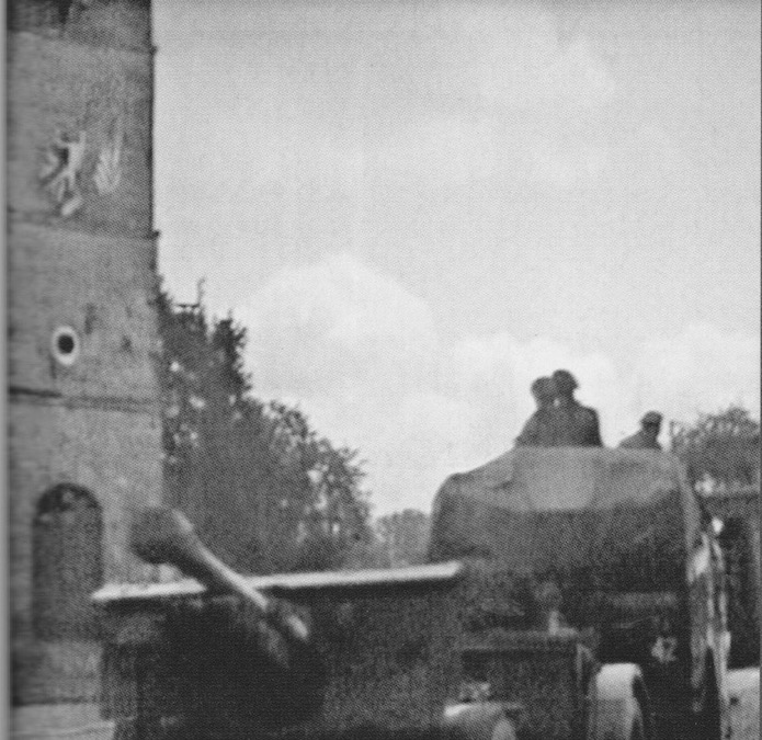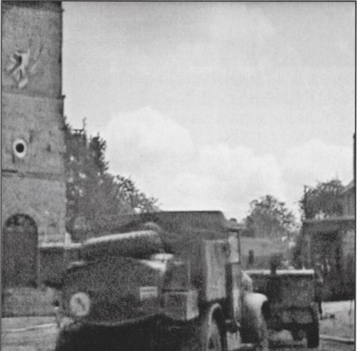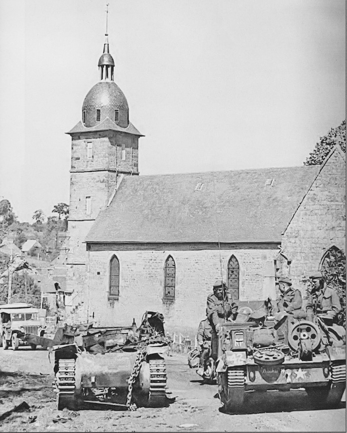 Un Bren-Carrier de la 50 ID passe devant une chenillette d’origine française utilisée pa les groupes allemandes et détruites lors des combats.