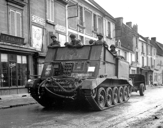 Un châssis de char Crusader recyclé en tracteur d’artillerie tractant un canon antichar Ordnance QF 17 pounder traverse la place Edmond Pailleud.