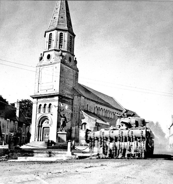 Le 15 juin 1944, un char Sherman Flail de déminage de la 79th Armoured Division traverse à grande vitesse le village de Creully. L’église Saint Martin n’a pas subit de dommage lors des combats. Le poilu du monument au Morts aborde les drapeaux depuis la libération du village.
