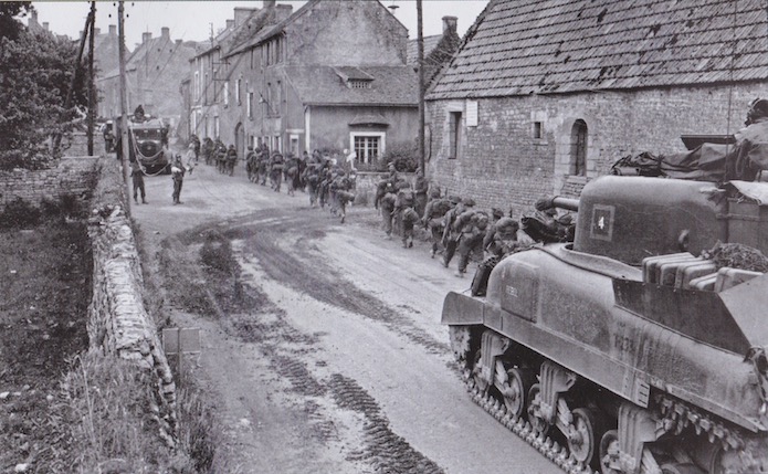 Quittant les plages du débarquement, des fantassins de la 50th Division et des tanks Sherman du 44th RTR, 4th Armoured Brigade, traversent Reviers, 12 juin 1944.