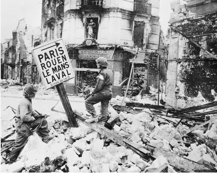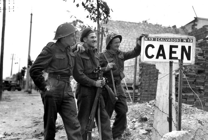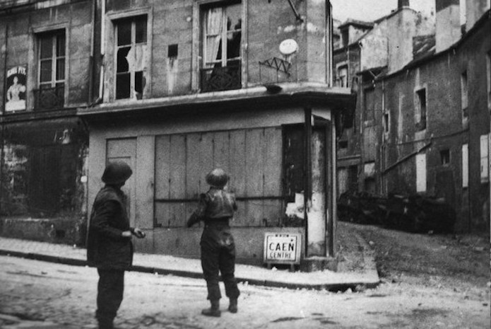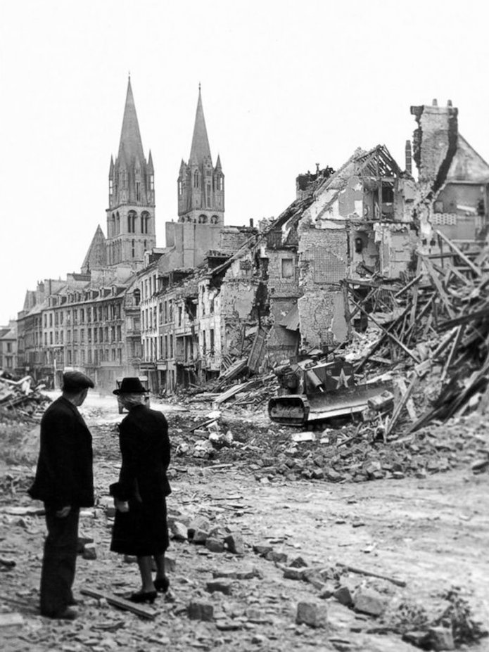 9 juillet 1944 : Les soldats canadiens ont investi le centre-ville. Ils découvrent un spectacle apocalyptique résultant des bombardements. Les décombres envahissent les rues et les immeubles sont réduits à quelques pans de murs squelettiques rongés par les flammes.