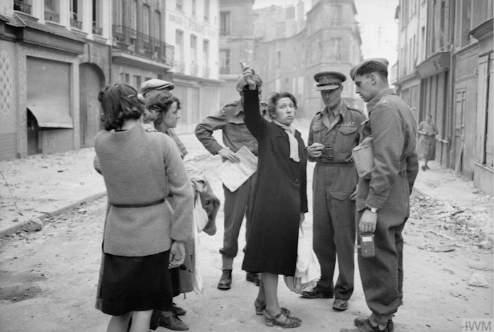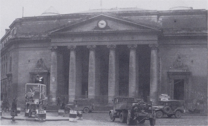 Eté 1944, un MP règle la circulation composée essentiellement de véhicules militaires devant le palais de justice resté intact. On aperçoit entre-autres un Dodge WC 51, un véhicule tractant une remorque équipée d’une station d’épuration et un véhicule léger.