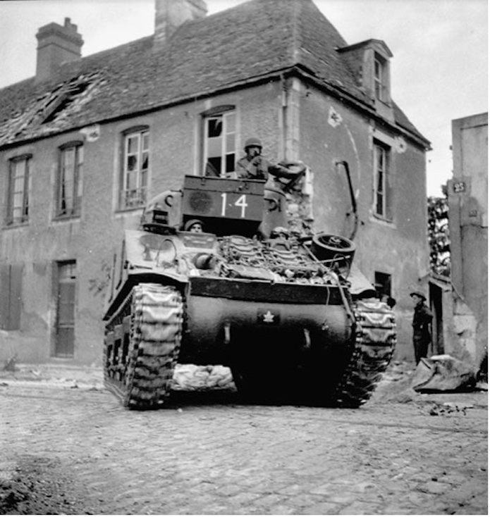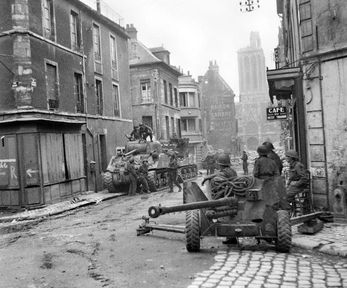 Deux chars Sherman de la 2eme brigade blindée canadienne progressent sur la place. Cette zone a été relativement épargnée par les bombardements.