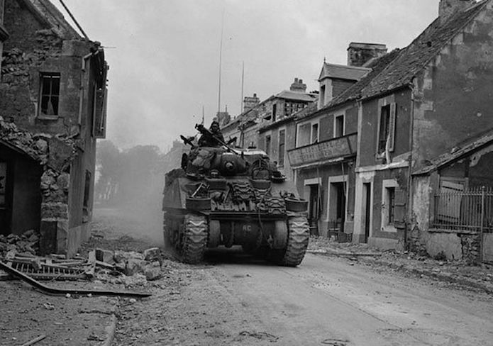 Les Canadiens pénètrent par l’ouest dans Caen le 9 juillet en descendant la rue. Les habitations ont peu souffert des combats. Une colonne de Sherman dont un Sherman d’observation d’artillerie se rue vers le centre-ville