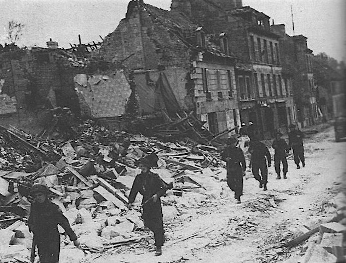 Un groupe de fantassins progresse dans la rue du général Moulin en longeant les ruines d’une maison détruite lors des bombardements.