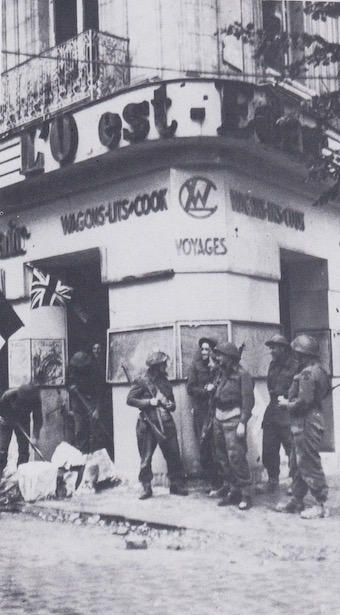 11 juillet 1944, un groupe de soldats anglo-canadiens savoure un instant de repos devant l’immeuble abritant le journal Ouest-Eclair. Celui-ci sera remplacé après-guerre par l’Ouest-France qui occupera durant de nombreuses années cet immeuble resté intact.