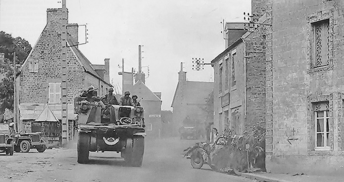 Dans l’après-midi du 30 juillet 1944, Lucerne d’Outremer est traversée par des colonnes légères de véhicules allemands. Ces véhicules, appartenant au LXXXIV.(84.r.) Armee-Korp ,utilisent un itinéraire secondaire pour rejoindre le secteur de Brécery /Mortain. Une voiture de liaison allemande a été détruite au centre du village. Un M7 Priest du 94th Armored Field Artillery Battalion remonte la rue principale.
