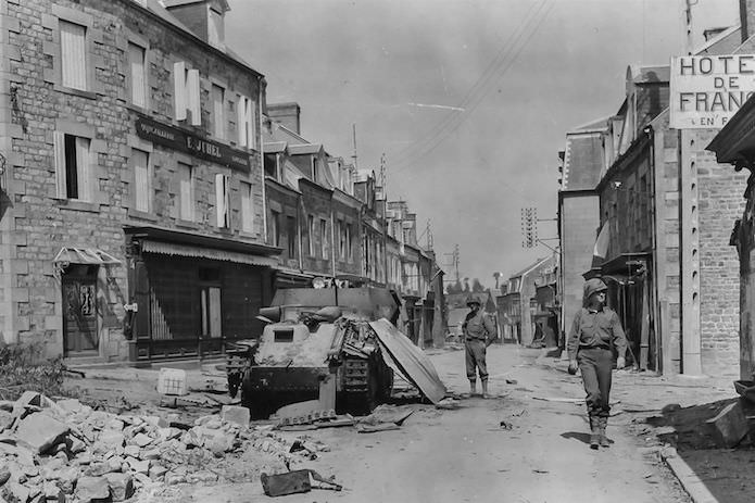 Dans la rue principale, un Flakpanzer 38(t) a été détruit par un projectile antichar tiré par un bazzoka. Tessy est entièrement libéré de toute présence ennemie comme le prouve l’allure décontractée des deux soldats américains.