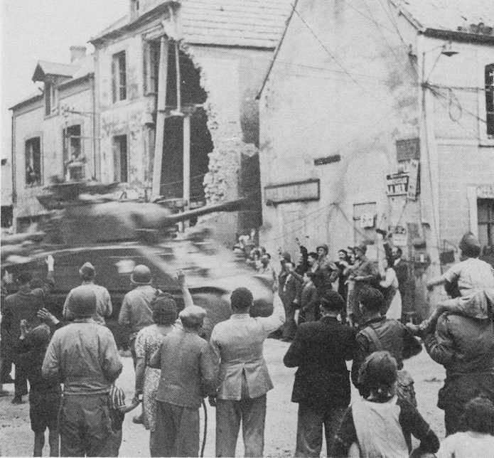 Un Sherman M4 traverse un carrefour dans Sainte-Mère-Eglise. Certaines habitations portent encore les marques des âpres combats qui s’y sont déroulés le 6juin 1944 .
