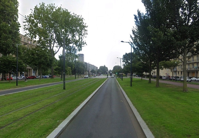Murs antichars boulevard Foch en direction de l’hôtel de ville. Nous sommes à l’angle des rues L. Philippe et Foch. Un second mur antichar passe à l’ouest de ce carrefour.