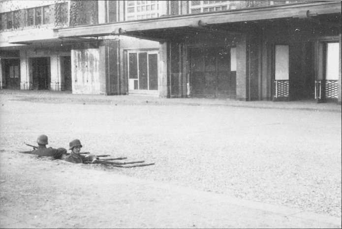 Fantassins allemands retranchés dans des trous individuels creusés face à l’entrée de la gare.