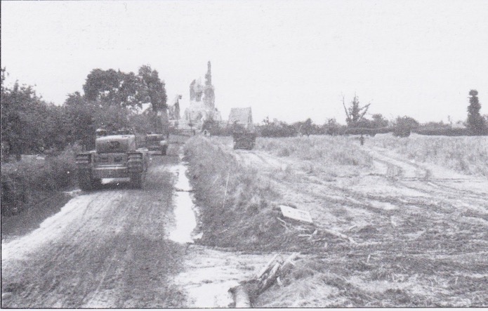 L’église Notre-Dame des labours vue depuis le nord. Des chars Churchill progressent vers Bretteville. Superbe poste d’observation car dominant la plaine environnante, l’église et son clocher ont été la cible des tirs de l’artillerie.