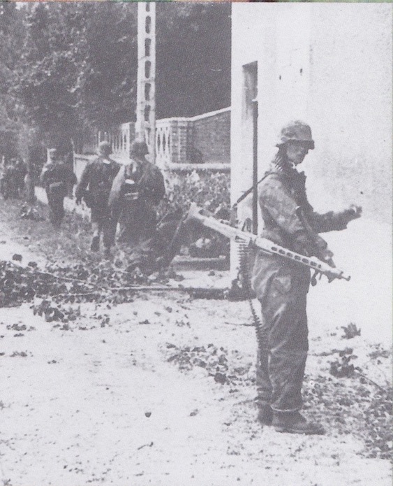 Des Panzer-grenadiers de la 12. SS Panzerdivision quittent la venelle où ils s’étaient mis à l’abri. Le tireur MG porte en sautoir une terrible MG42 dont la cadence de tir avoisine les