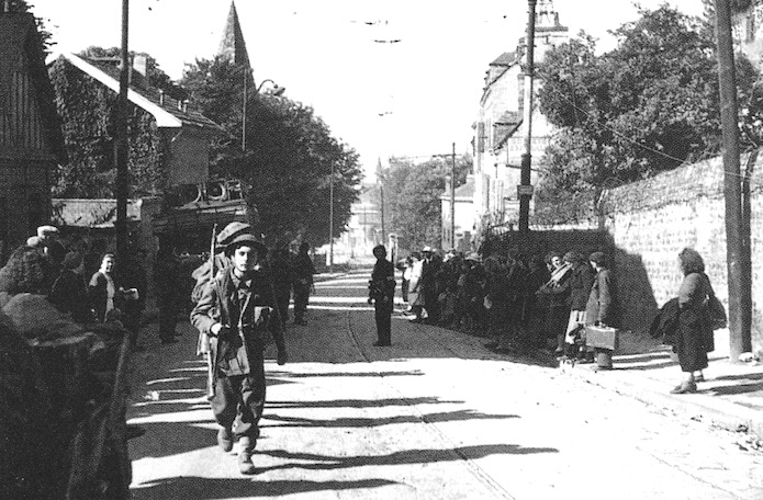 Pendant que les « Ours Polaires » (49th W.Y.Div.) remontent vers leurs points de regroupement pour poursuivre leur route vers la Belgique, les civils qui les regardent sortent d’abris creusés dans les pentes, à droite, rue Georges Lafaurie. Le maigre baluchon qu’ils ont à la main est, pour la plupart d’entre eux, le seul bien qui leur reste.