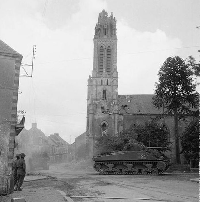 Le 30 juillet 1944, lors de l’opération « Bluecoat », un Sherman passe devant l’église. Il appartient probablement à la Guard Armoured Division. Cette unité sera engagée le 31 juillet dans le secteur sous contrôle du 8eCorps. Son objectif sera la longue ligne de crêtes et de de collines allant de Saint-Martin-des-Besaces à Thury-Harcourt où elle sera opposée à la 21.Pz-Div.
