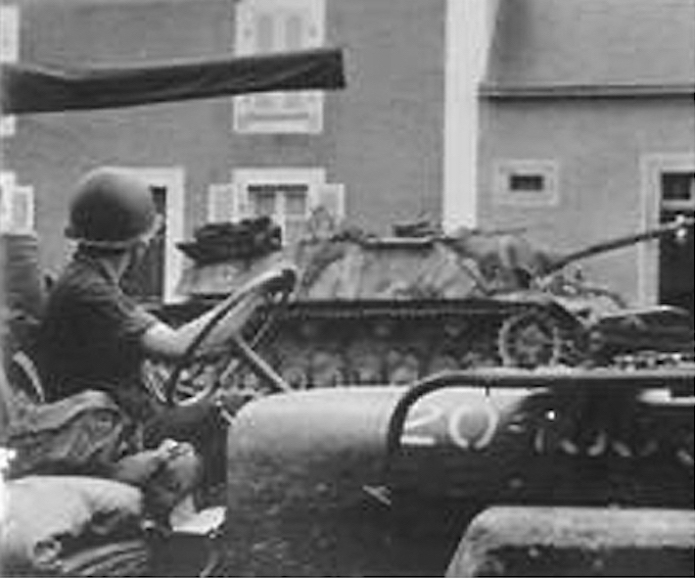 Une patrouille américaine traversant le village à bord d'une Jeep passe devant l'épave du Jagdpanzer IV/L48