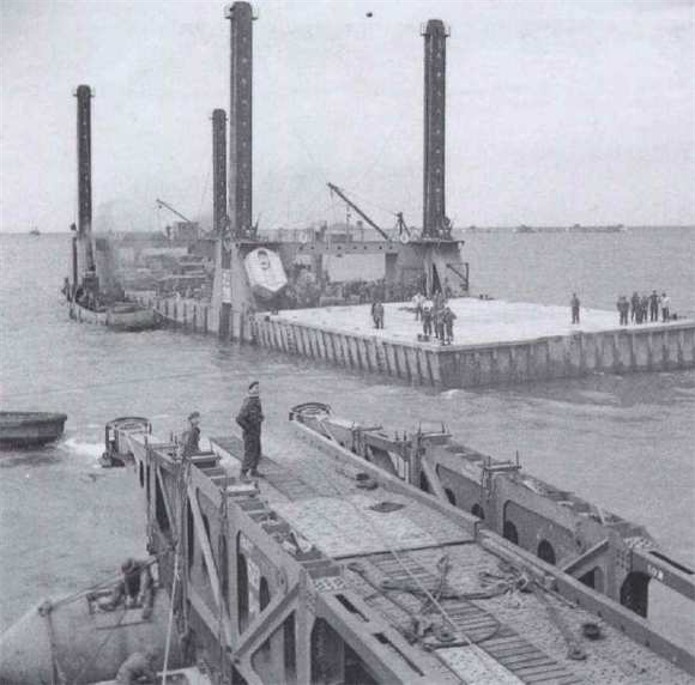 Les jetées raccordaient les plates-formes au rivage. Entre le quai et la terre ferme, une jetée métallique reposait à intervalles réguliers sur les caissons étanches dit " bettle ou scarabée ".