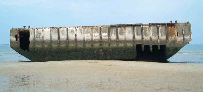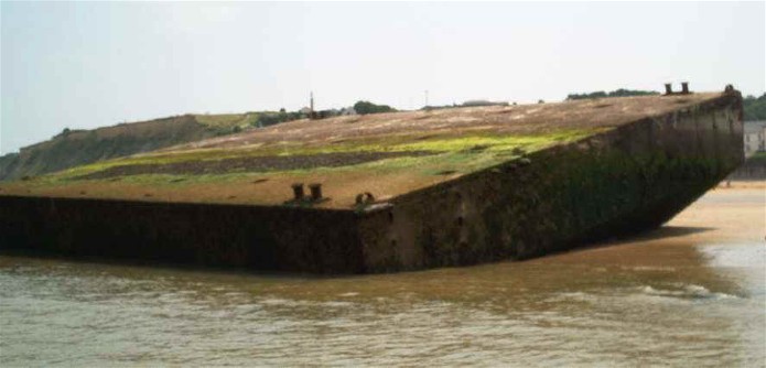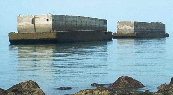 Vestige les plus visibles du Mulberry, 150 caissons furent construits en Angleterre. Remorqués à travers la Manche, ils furent coulés parallèlement au rivage afin de servir d’ossature aux digues protégeant le port artificiel. Il existait 6 types de caissons dont les mensurations avaient été calculées en fonction de la profondeur de l’eau à l’endroit ou ils devaient être coulés. Le tonnage varie entre 1500 et 6000 tonnes. Les plus gros éléments mesuraient 70 m de long, 13 m de large et 20 m de haut. Leur assemblage formait une digue de plus de 3500 m.