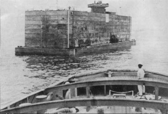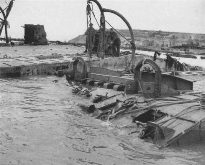 Les blockships étaient des vieux navires condamnés à mort et des caissons de béton envoyés au fond de l’eau. Mis bout à bout cette ligne de navires-bloqueurs formaient une digue longue de 7 km.