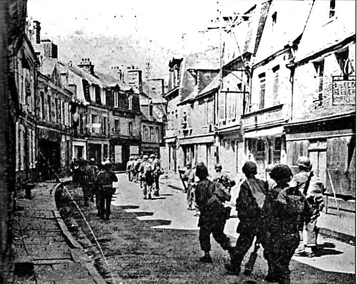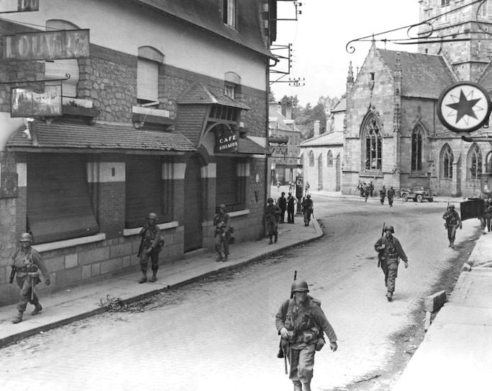 Le 2 août 1944, les fantassins du 12th Infantry Regiment progressent dans le centre-ville de Villedieu-les-Poêles (actuelle voie de la Liberté). Les Allemands ont évacué la ville sans combat malgré son importance stratégique mais continuent à combattre dans la campagne environnante.