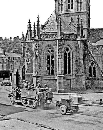 Un half-track M3 tractant un canon antichar M1 de 57 mm traverse la place de la mairie. Ce type de matériels est en dotation dans l’Anti-Tank Company ou dans l’ Anti-Tank Detachement du 12th Infantry Regiment.