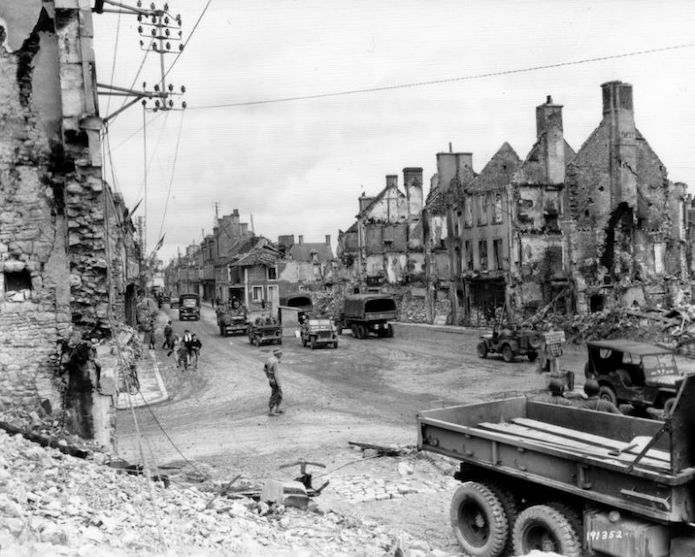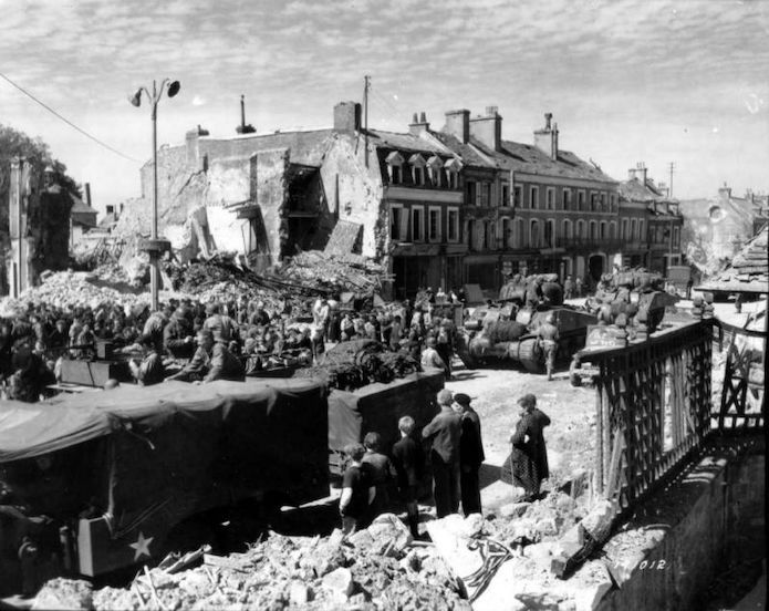 Une colonne de véhicules américains composée de Dogde , Half-Tracks et chars Sherman stationnent dans la rue Émile Demagny. Un pâté de maisons a résisté aux souffles des explosions qui ont détruit une grande partie de la ville.