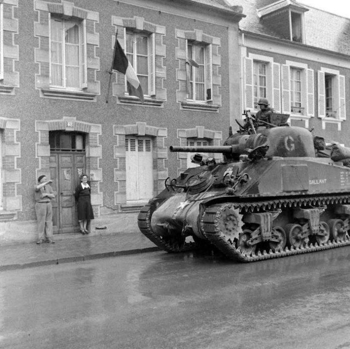 Le char Sherman M4 baptisé « Gallant » remonte la rue de Cherbourg sous les acclamations du couple habitant au N°48 . La porte de la maison est décorée avec des drapeaux alliées et les «Trois Couleurs » flottent sur la façade.