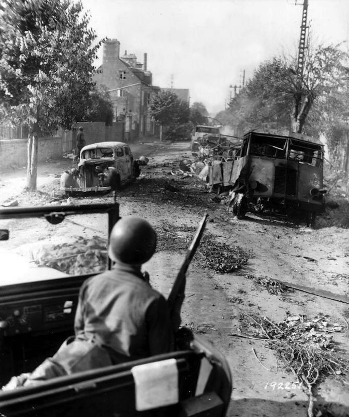 Une patrouille américaine à bord d’un Dodge command car remonte une colonne de véhicules allemands incendiés. Au premier plan, on aperçoit un Renault AHN qui semble chargé de bidons de carburant. Ce camion est construit dans les usines réquisionnées par les Allemands et caractéristique par ses ridelles en métal.