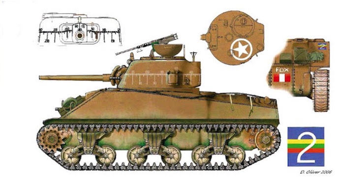 Débarqué le 6 juin sur la plage Sword, un Sherman V (OP) baptisé FOX suivi deux deux Centaur CS IV du Royal Marines Armoured Support Group (RMASG) 1st Armoured Regiment progressent vers Tilly. La photographie a été prise la 13 juin.
