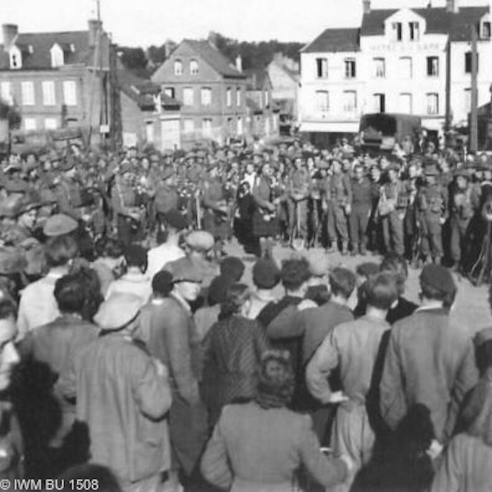 Photographie d’un groupe de soldats britanniques sur la place de la gare. Les soldats à gauche portent leurs équipements de combat et ont conservé leurs armes . Notez un fantassin équipé d’une pelle. Le groupe de droite est en tenue de repos.