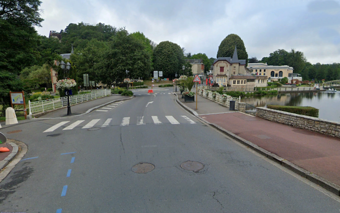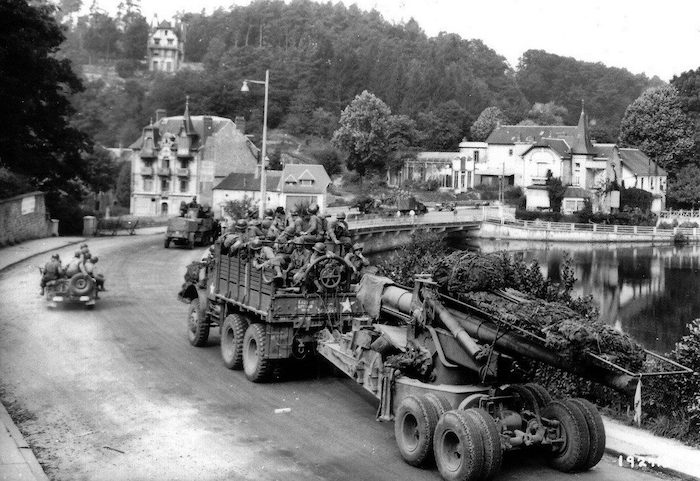 Appartenant au 1st Field Artillery Regiment, ce Mack NO prime mover 7 ½-ton 6x6 remorque un “Long Tom” et son convoi (Jeep et MGMC M16) traverse le pont menant au casino de Bagnole-de-l’Orne.