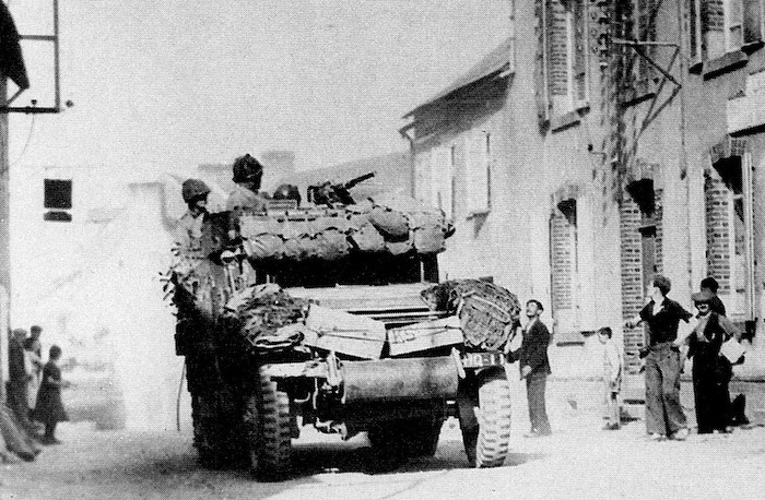 Sous les acclamations de la population nouvellement libérée, un half-track d’une compagnie d’état-major "HQ 11" appartenant probablement à l’infanterie portée de la 5th Armored Division et lourdement chargé de sacs, de caisses de rations et de filets traverse le village.