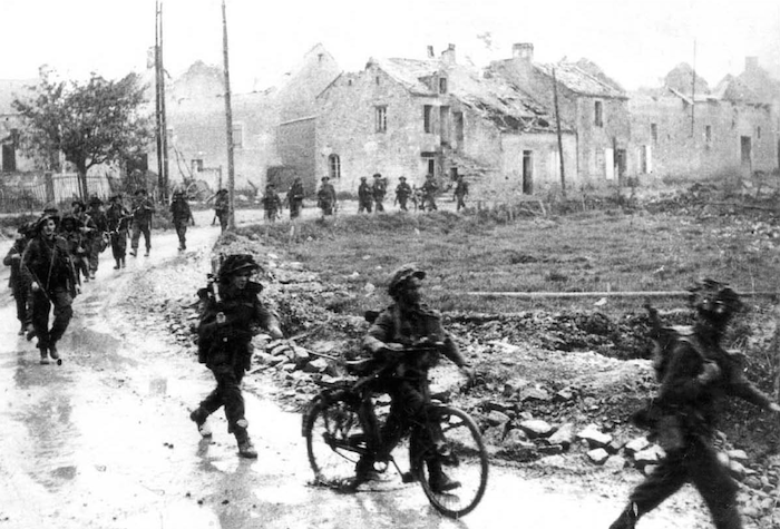 Fontenay-le-Pesnel est aux mains des Britanniques. Les fantassins continuent leur progression en passant par la rue du lavoir.