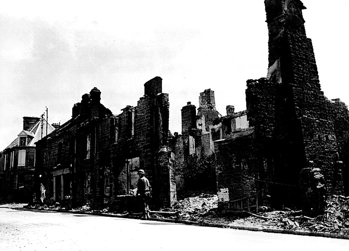 Été 1944. La guerre s’éloigne peu à peu, mais elle laisse derrière elle les traces de son passage. Vers le 5 août, les soldats américains entrent dans Juvigny et libèrent la commune. Les combats ont été violents. Beaucoup de maisons ne sont plus que ruines, éventrées par les obus. Dans la rue de Mortain, les façades déchiquetées témoignent encore de la brutalité des affrontements. Les gravats ont été repoussés sur les côtés, formant une voie étroite que remonte lentement un soldat américain, silhouette solitaire au milieu des décombres.