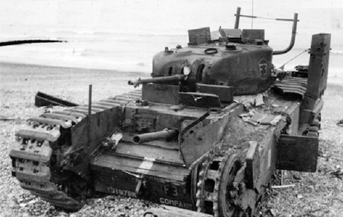 La photographie présente COMPANY vu de son flanc gauche, orienté vers l’est. Plus bas sur la plage se distingue le TLC-3 n° 159, avec BEETLE sur sa gauche. Sur le côté de la tourelle, on observe des fragments arrachés du dispositif d’étanchéité dit « Deep Wading », encore fixés à la structure.