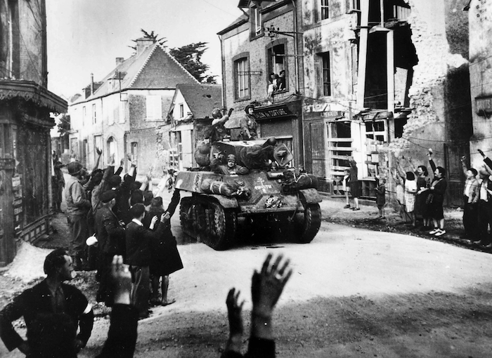 Après avoir débarquée sur Utah Beach le 1 août 1944, la 2e Division Blindée de Leclerc traverse la ville de Sainte-Mère-Église pour rejoindre la ligne de front. Une colonne blindée remonte l’actuelle rue du général Koenig sous les acclamations des habitants. Certaines habitations ont subi des dégâts importants lors des combats pour la libération de la ville. Le char photographié est un Stuart M3A3.