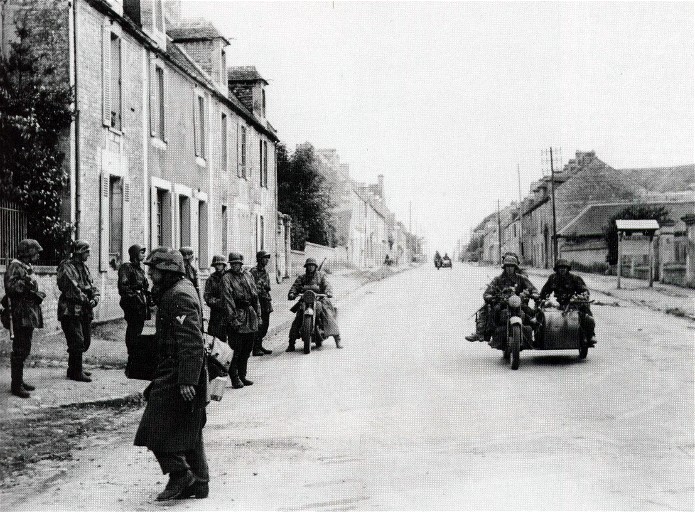Des motocyclistes de la division « HJ » traversent Verson et rencontrent un groupe de grenadiers de la 21.Panzer-Diviison.