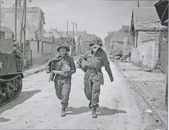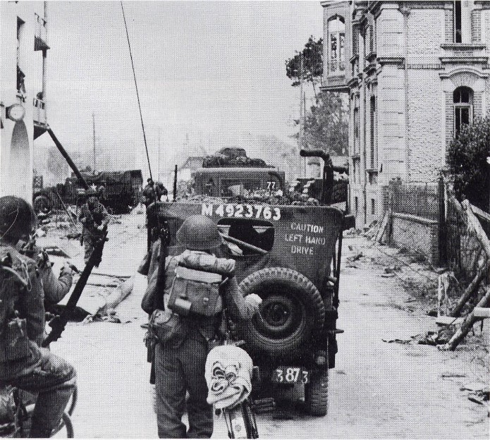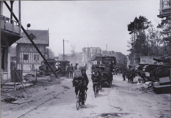 Photographie prise par le Sergeant Mapham. Au milieu du carrefour un Sergeant du n°5 Beach Group règle la circulation. Les véhicules appartiennent au 2nd KSLI de la 185th Brigade. Notez le Bren Carrier entièrement équipé d’un kit de débarquement rehaussant sa silhouette.