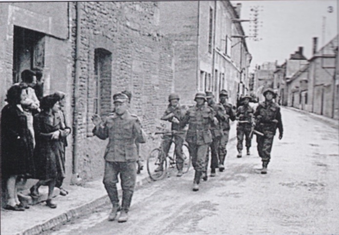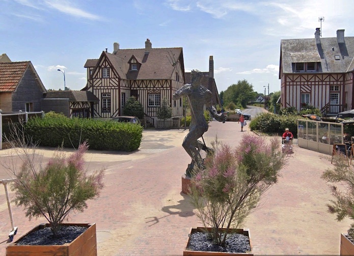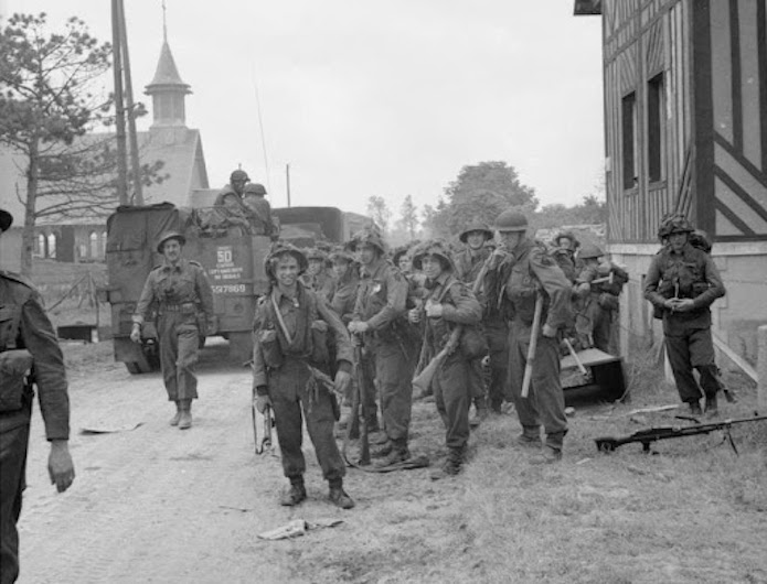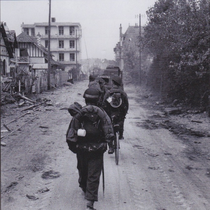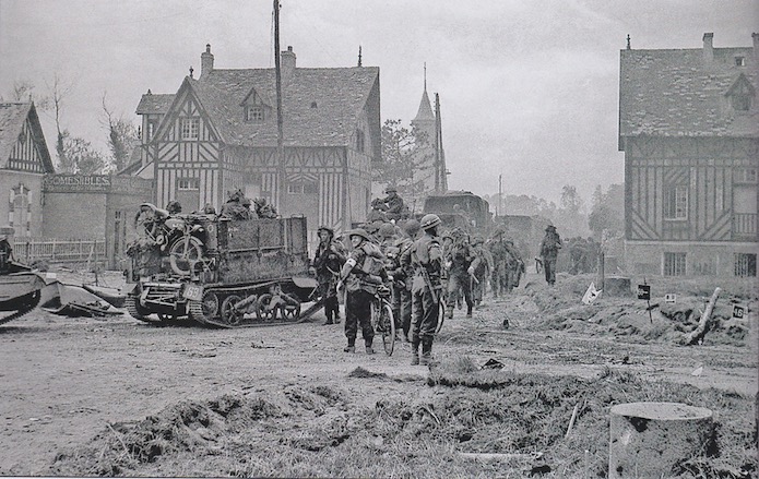 Ayant quitté le secteur de la plage, les fantassins britanniques progressent dans le village Hermanville et passent devant le monument aux Morts.