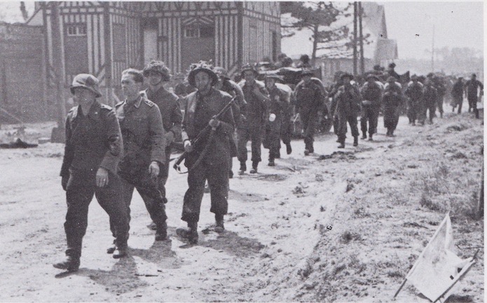 Les premiers prisonniers allemands capturés par l’infanterie légère du King’s Shropshire sont dirigés vers les plages en vue de leur transfert vers l’Angleterre.