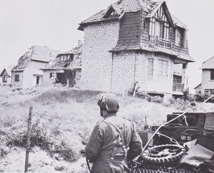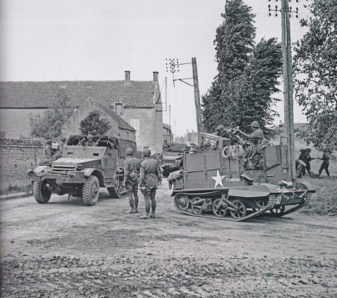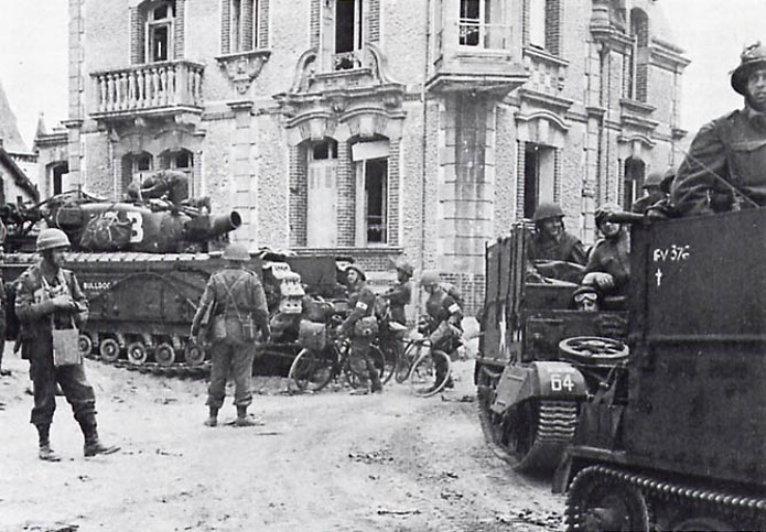 Un half-track (pos 27th Armoured Brigade) et un Bren Carrier de la n°246 Field Company (chiffre « 50 » sur l’engin) dont le rôle est de déminer le terrain traverse le carrefour.