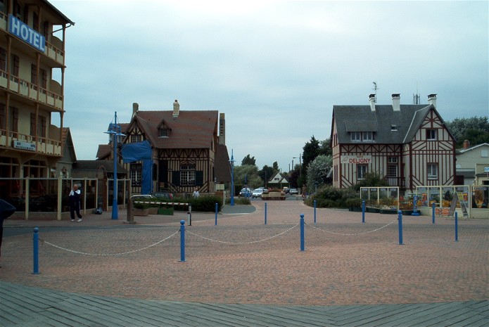 Un Churchill Petard appartenant à la 79 Division blindée du génie britannique précédé par des Bren Carrier équipés du dispostif « Deep wading » de la 3e division britannique traversent la place