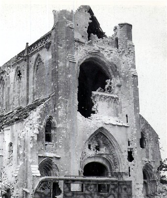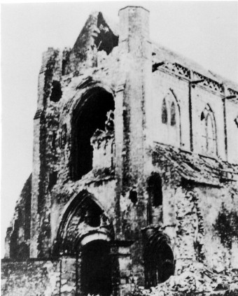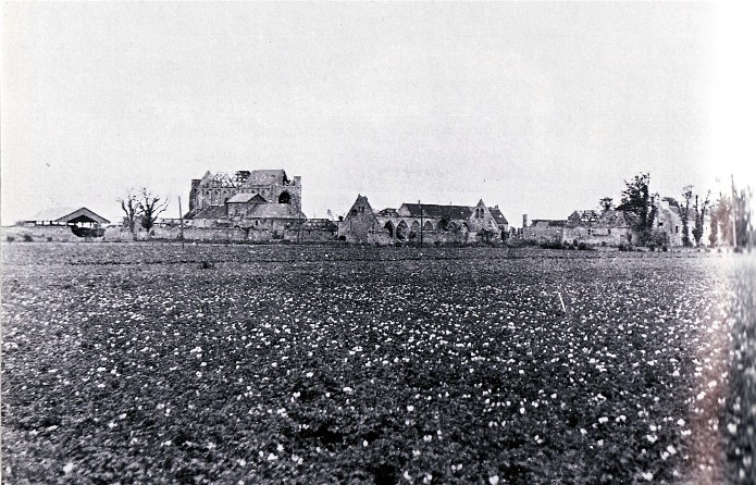L’abbaye d’Ardenne, en 1946. Cette photographie a été prise en direction du sud à partir de la ligne de dépaet de l’attaque de la 7e brigade.
