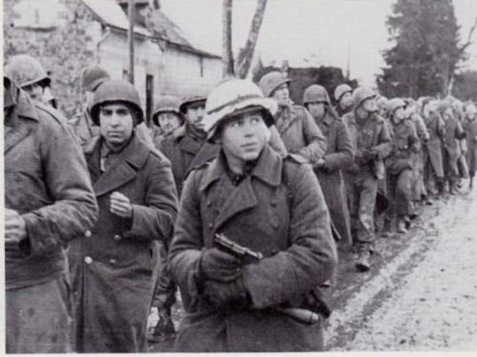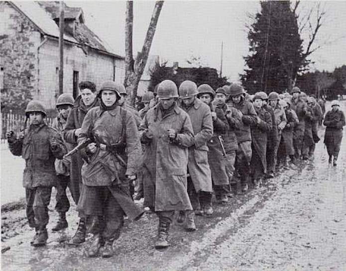 Gros plan d’un jeune soldat allemand encrant la colonne de prisonniers américains. Il est armé d’un simple Lüger. Lui et un certain nombre de prisonniers regardent avec inquiétude le ciel dans lequel évolue un chasseur américain faisant un « straffing » sur une proche colonne allemande.