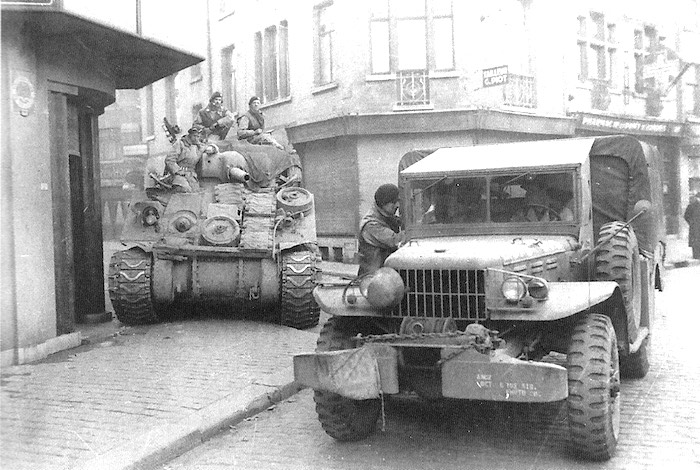 Un peu plus haut de l’avenue, hauteur rue Tillieux, un haute char Sherman s’est lui aussi embossé à l’angle de la rue. Le Dodge 4x4 appartient à une équipe de correspondants de guerre.