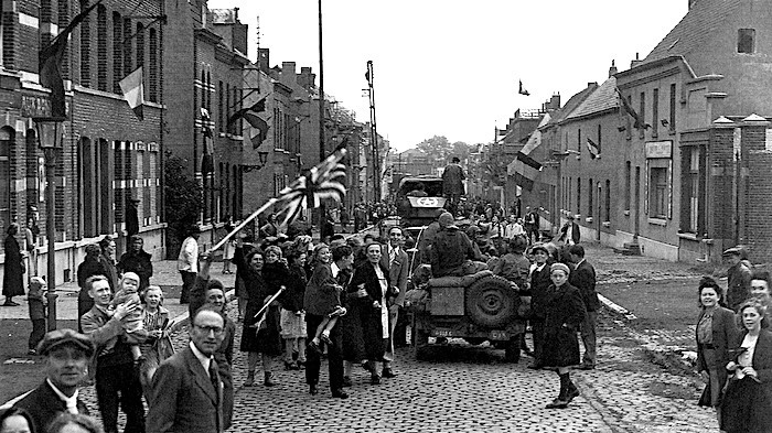 En fin de soirée du 2 septembre 1944, les avant-gardes du XIX Corps entrent dans Tournai. Sur cette photographie prise deux jours plus tard, on identifie une jeep du 113th Cavalry Group précédée par une auto-blindé britannique. Les maisons sont pavoisées avec de nombreux drapeaux et la population acclame chaleureusement les troupes américano-britanniques.