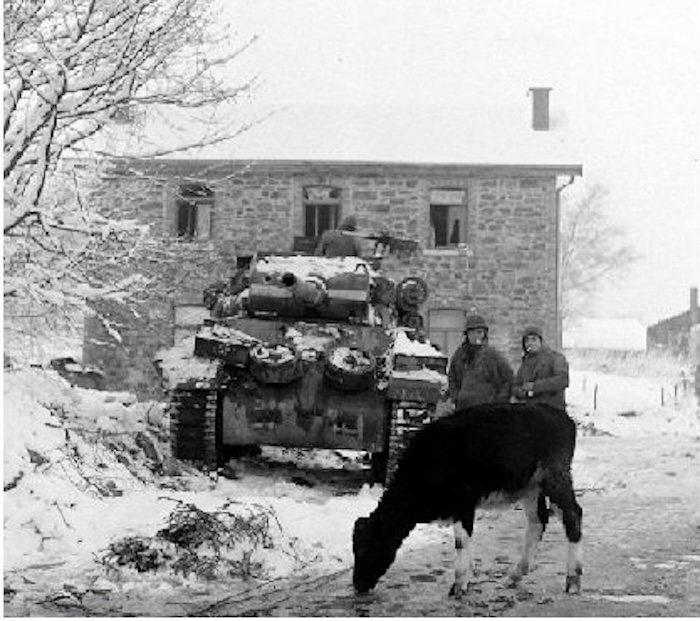 Un chasseur de char américain TD M-36 Jackson a pris position devant une maison dans le village de Fosse. Le cliché a été pris après les importantes chute de neige tombées en fin décembre 1944. L’attitude décontractée des membres de l’équipage laisse à penser qu’il n’y a pas de menace ennemie.