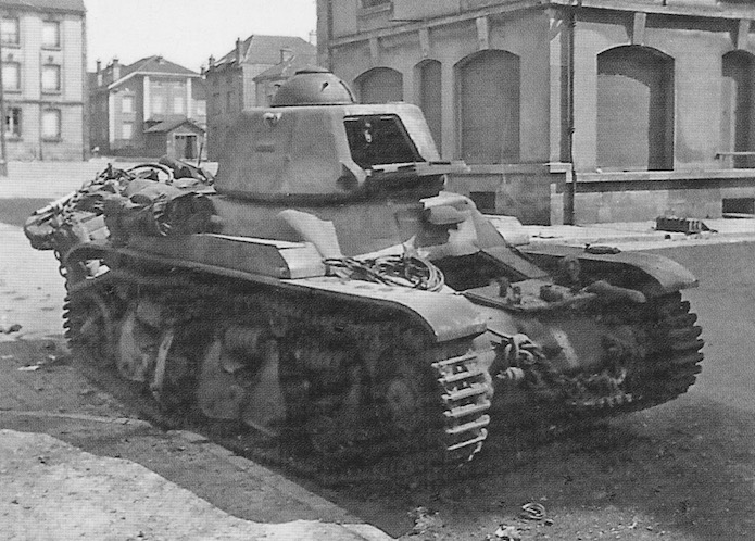Touché par un obus au coin de la place Colonel Darche, un R35 c de la 1re Cie du 5e BCC est entièrement calciné .