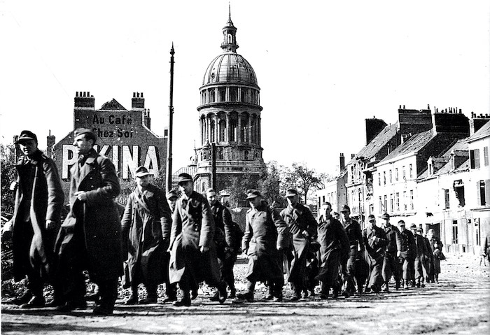 Les combats sont terminés. Une longue colonne de prisonniers allemands quitte la vieille ville.